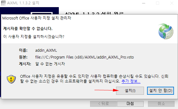 4. Microsoft Office 사용자 지정 설치(Add_in) 합니다. "설치" 버튼을 클릭