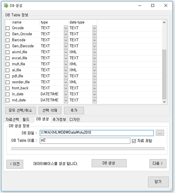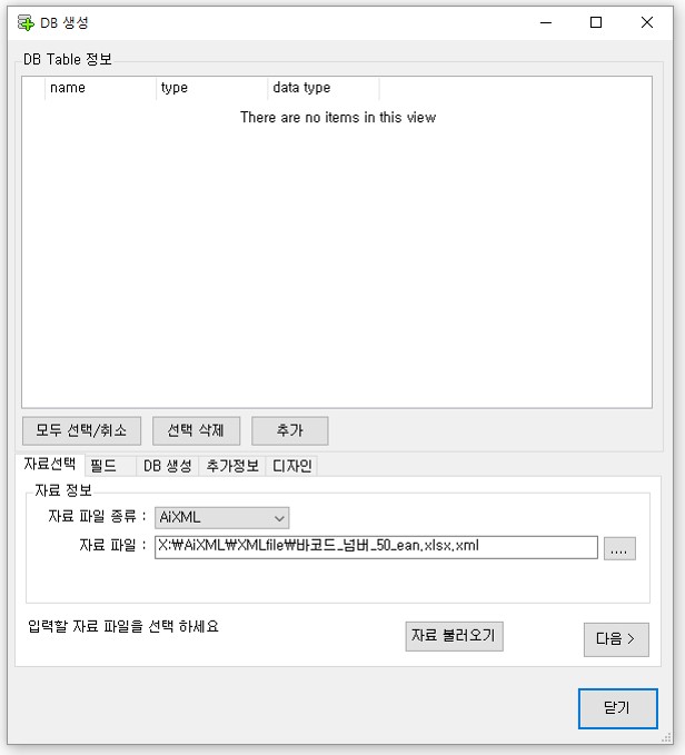DB를 생성하기 위하여 "자료선택"에서 필드,자료가 있는 파일을 선택 합니다. 파일의 종류는 Excel, CSV, Infor(XML), AiXML의 파일을 선택 할 수 있습니다.