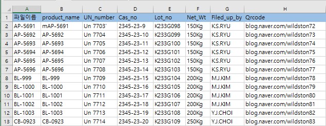 Row 1번에 들어가는 값들이 DB의 Key으로 지정 합니다.