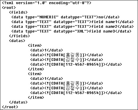 “<datas>”의 “<item>”은 “<fields>”에서 지정한 Key의 자료들이 순차적으로 들어갑니다.