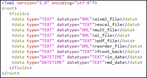 “<fields>” : Tag는 DB의 KEY를 지정하며 속성으로 “TEXT”,”DATETIME”등을 지정 할 수 있습니다.