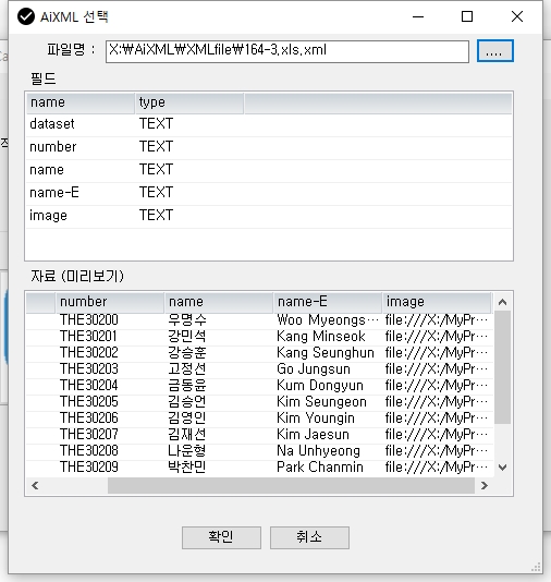 위의 화면처럼 "...."버튼을 클릭하여 파일을 선택하면 AiXML있는 자료가 화면에 나타납니다.