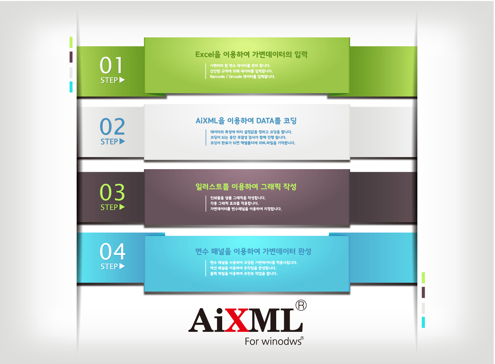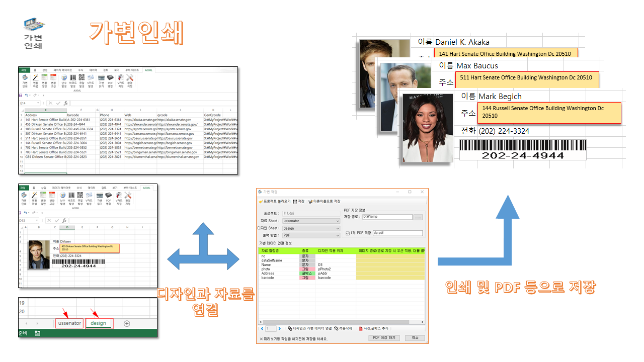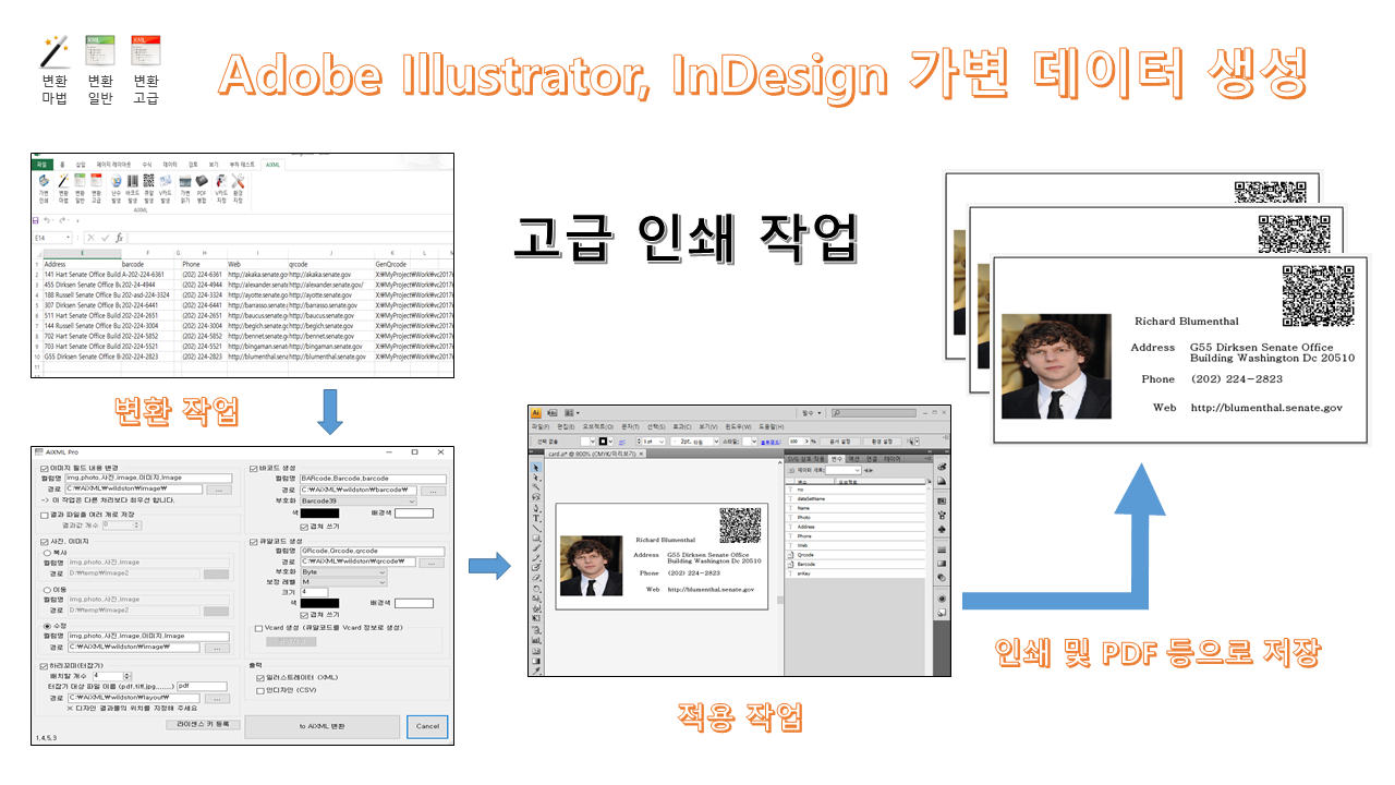 Microsoft offie의 Excel자료를 이용하여 디자인적용 인쇄 및 PDF로 저장이 가능 하며 Adobe Illustrator 및 InDesign의 가변 데이터 처리용 XML 파일로 변환 하는 프로그램 입니다.