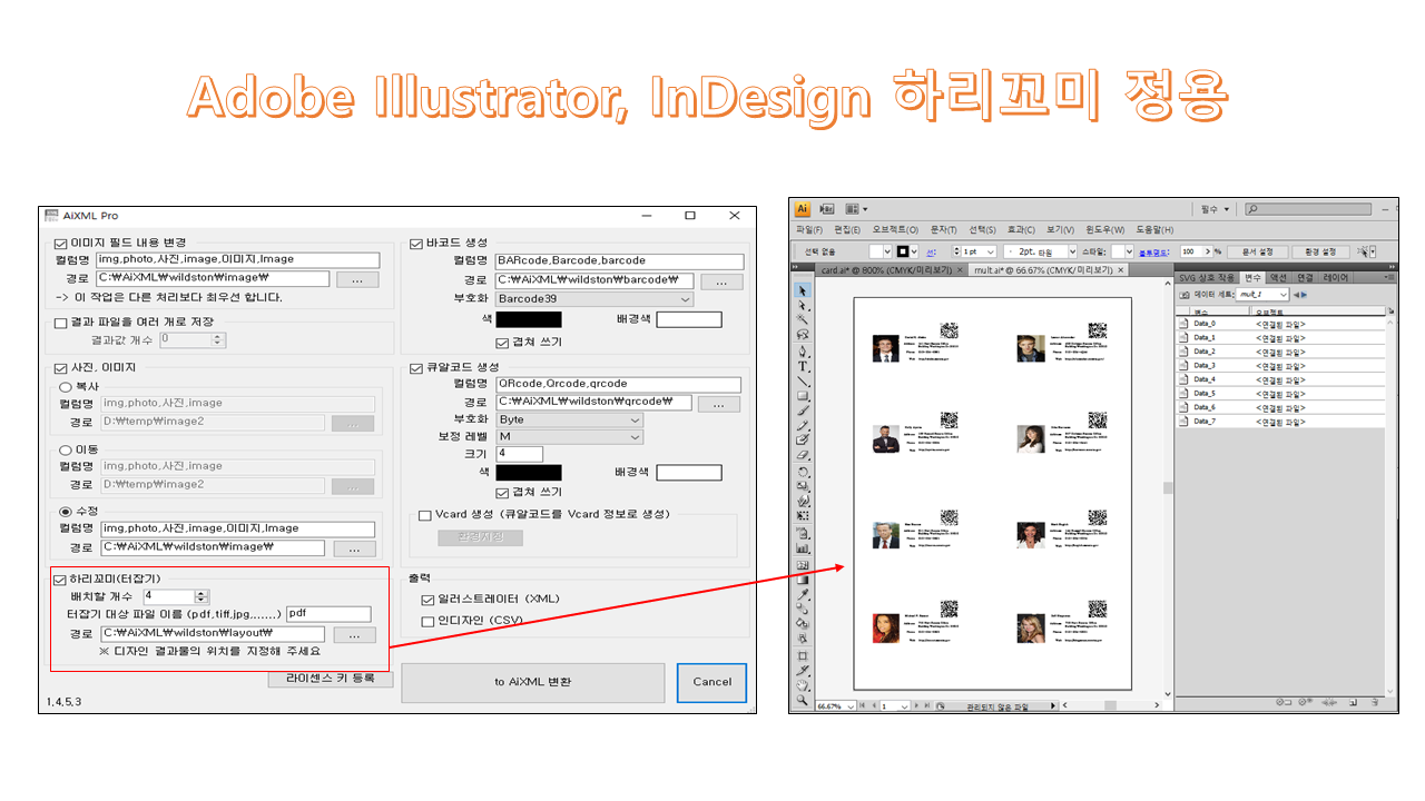 Adobe Illustrator 및 InDesign의 기능 중의 하나인 "템플릿 및 변수를 통한 데이터 기반 그래픽"기능을 기반으로 인쇄용 파일을 생성 하는 프로그램으로,