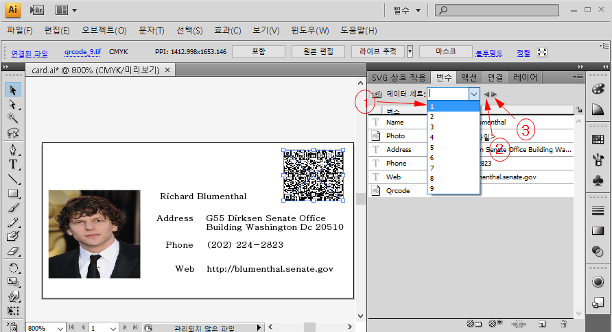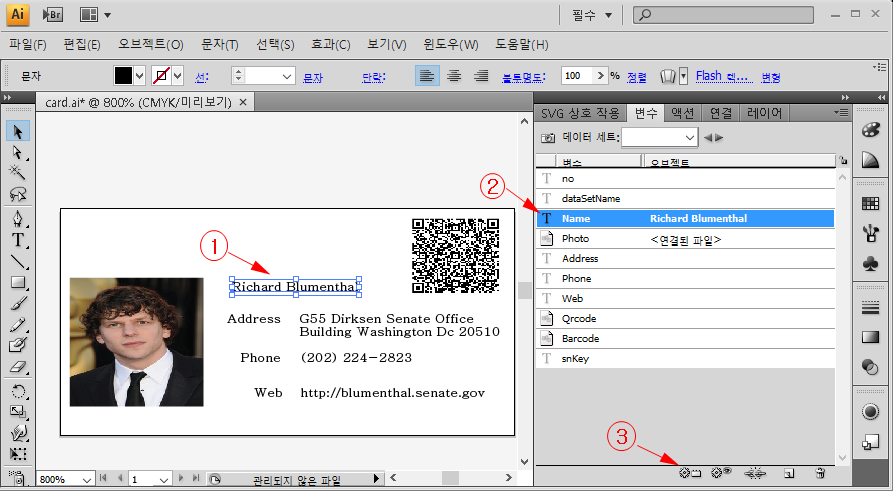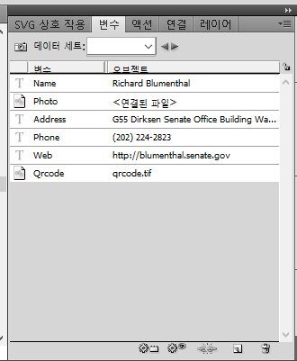 1. 디자인된 화면에서 가변데이터로 쓸 텍스트와 이미지들을 지정하여 가변데이터로 등록하여 줍니다.