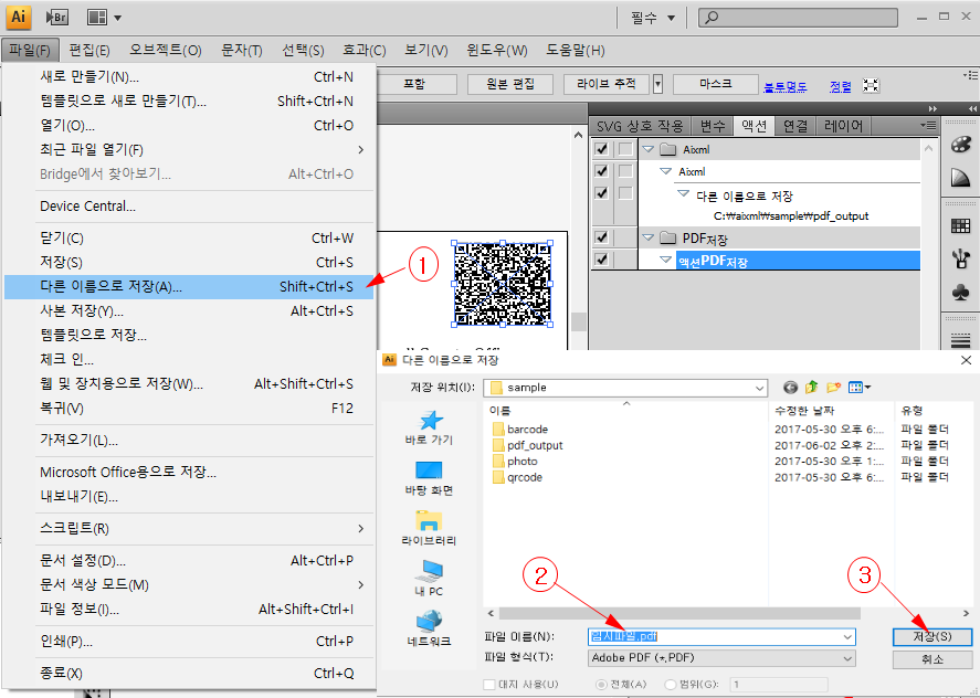 액션화면에서 [PDF저장]-[액션PDF저장]-[다른 이름으로 저장]을 확인 할 수 있습니다.