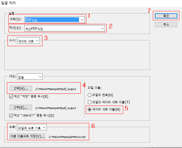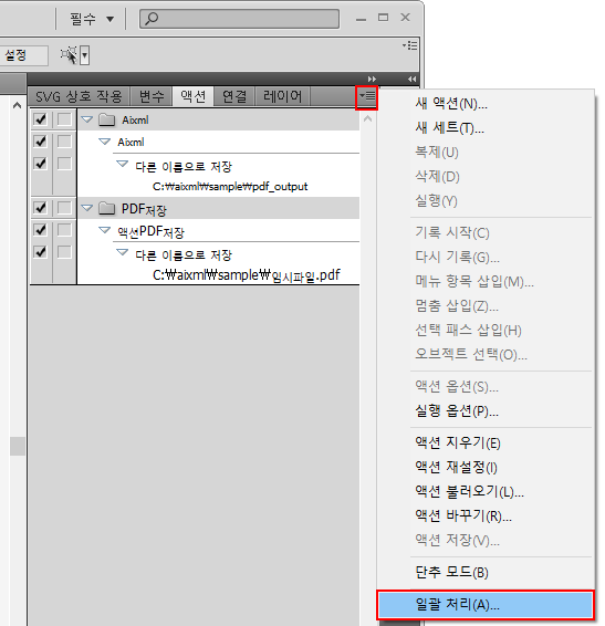 액션파일을 생성한 다음 [액션]패널의 메뉴를 열어 [일괄처리]를 실행 합니다.